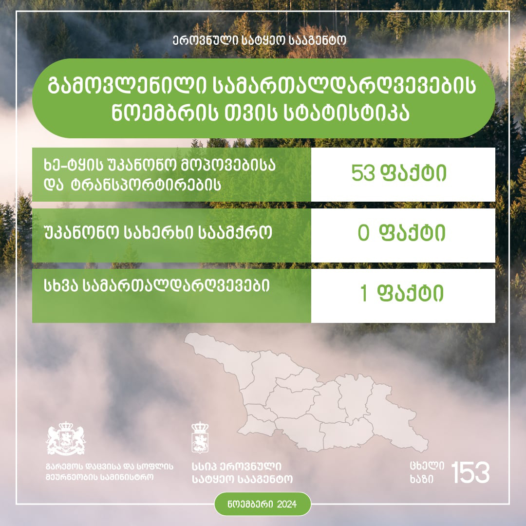 30 violations were detected by employees of the Kakheti Forestry Service, 5 - by employees of the Samtskhe-Javakheti, 1 - by employees of the Mtskheta-Mtianeti, 10 - by employees of the Imereti Forestry Service, 3 - by employees of the Kvemo Kartli and 4 - by employees of the Shida Kartli Forestry Services.