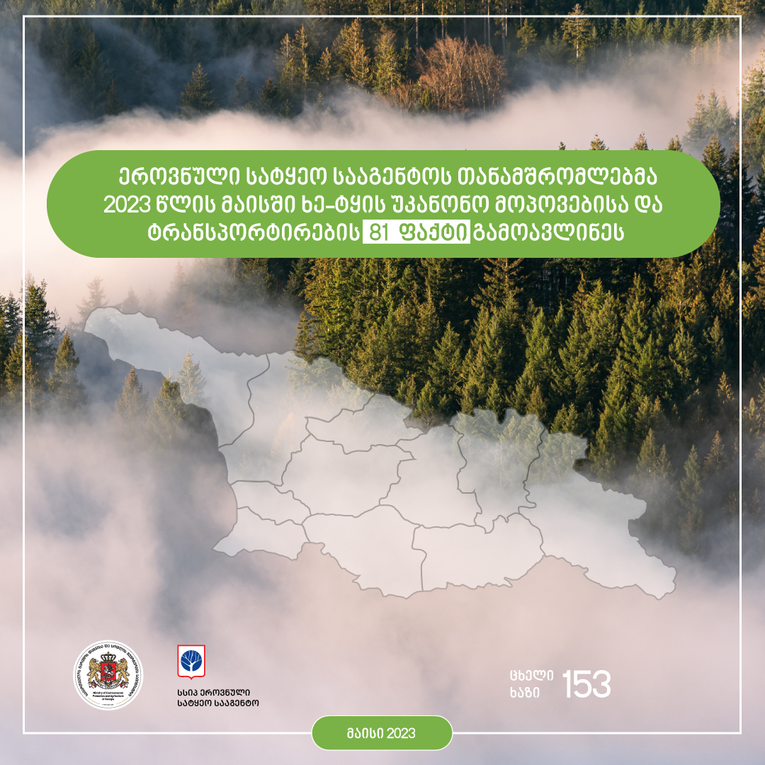 გარემოს დაცვისა და სოფლის მეურნეობის სამინისტროს სსიპ ეროვნული სატყეო სააგენტოს რეგიონული სატყეო სამსახურების თანამშრომლებმა, მიმდინარე წლის მაისის თვეში, ქვეყნის მასშტაბით, ხე-ტყის უკანონო მოპოვებისა და ტრანსპორტირების 81 ფაქტი გამოავლინეს.