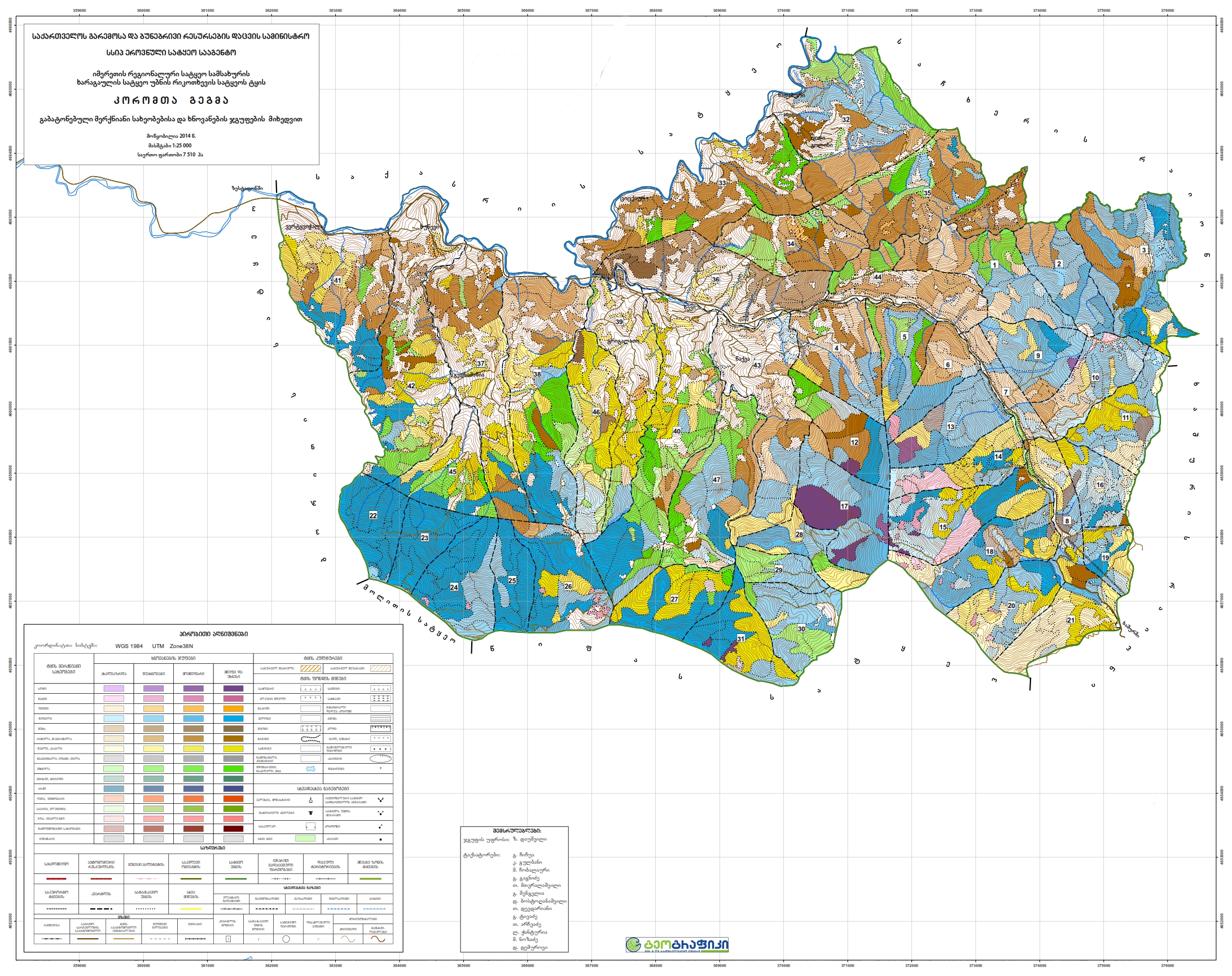ხარაგაულის სატყეო უბნის ტყის სქემატური რუკა გაბატონებული სახეობების და ხნოვანების ჯგუფების მიხედვით