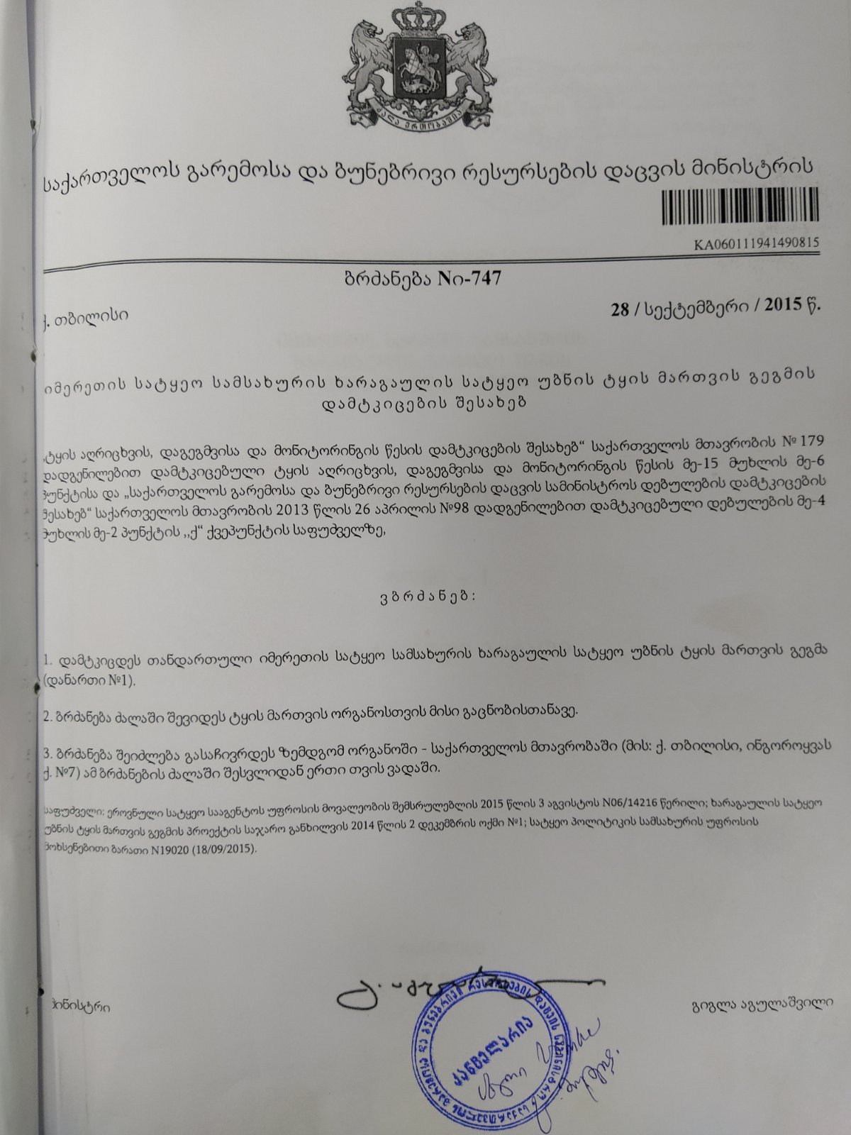 ბრძანება იმერეთის სატყეო სამსახურის ხარაგაულის სატყეო უბნის ტყის მართვის გეგმის დამტკიცების შეს